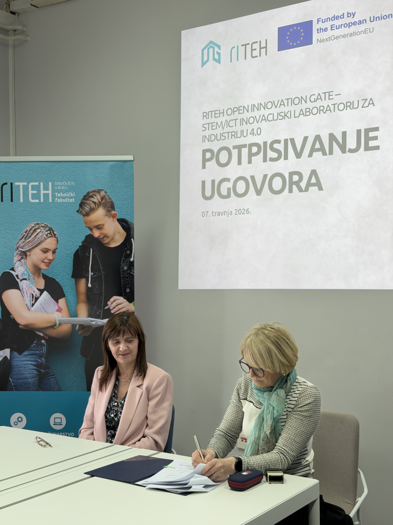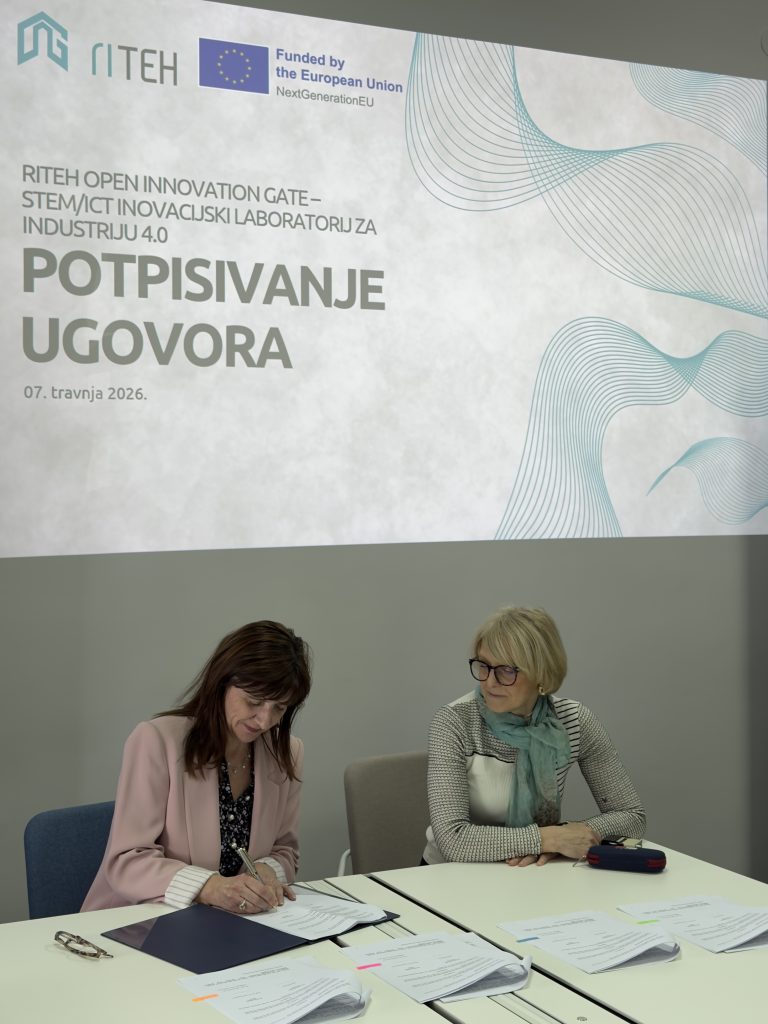Tehnički fakultet Sveučilišta u Rijeci u utorak, 7. travnja, svečano je potpisao ugovor s dobavljačem za nabavu opreme u okviru projekta „RITEH Open Innovation Gate – STEM/ICT inovacijski laboratorij za Industriju 4.0“, čime je napravljen važan korak ka uspostavi nove istraživačko-inovacijske infrastrukture Tehničkog fakulteta, osmišljene kao otvoreni laboratorijski prostor za razvoj, testiranje i primjenu naprednih tehnoloških rješenja u području Industrije 4.0.