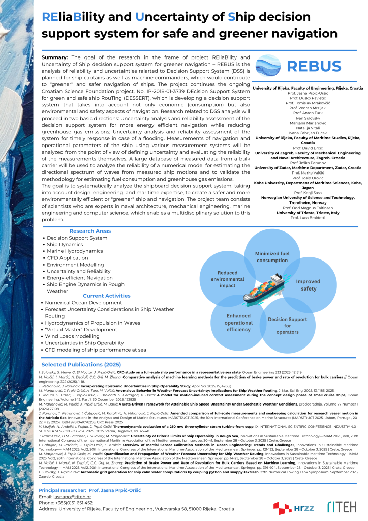 J. Prpić-Oršić, I. Sulovsky, M. Marjanović: REliaBility and Uncertainty of Ship decision support system for safe and greener navigation (REBUS), School of Naval Architecture and Ocean Engineering (SNAOE) of Indian Maritime University, Ship Life-Cycle Modelling and Simulation Challenges – International Expert Lecture Series 6.2.2024.