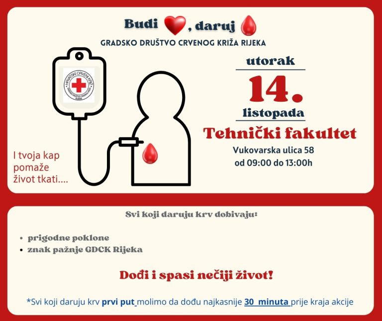 Poštovani zaposlenici, studentice i studenti, pridružite se svojim kolegama, donesite osmijeh potrebitima i postanite dio velike obitelji darivatelja! Zajedno činimo Tehnički fakultet – mjesto humanosti, solidarnosti i zajedništva. Pozivamo Vas na akciju Darivanja krvi na TFR-u dana 14.10.2025. od 9