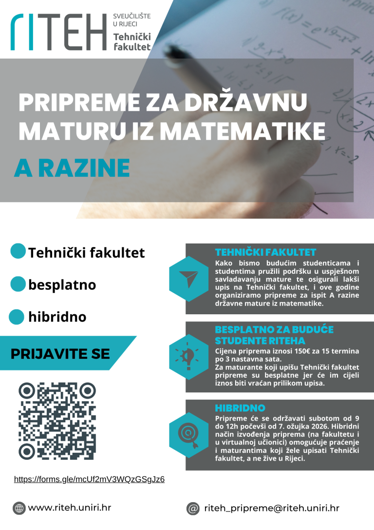 Besplatne pripreme za ispit A razine državne mature iz matematike za buduće studentice i studente Tehničkog fakulteta. Kako izgledaju pripreme? Kako bi maturanticama i maturantima, budućim studenticama i studentima, omogućili uspješno polaganje mature, a time i uspješan upis na Tehnički