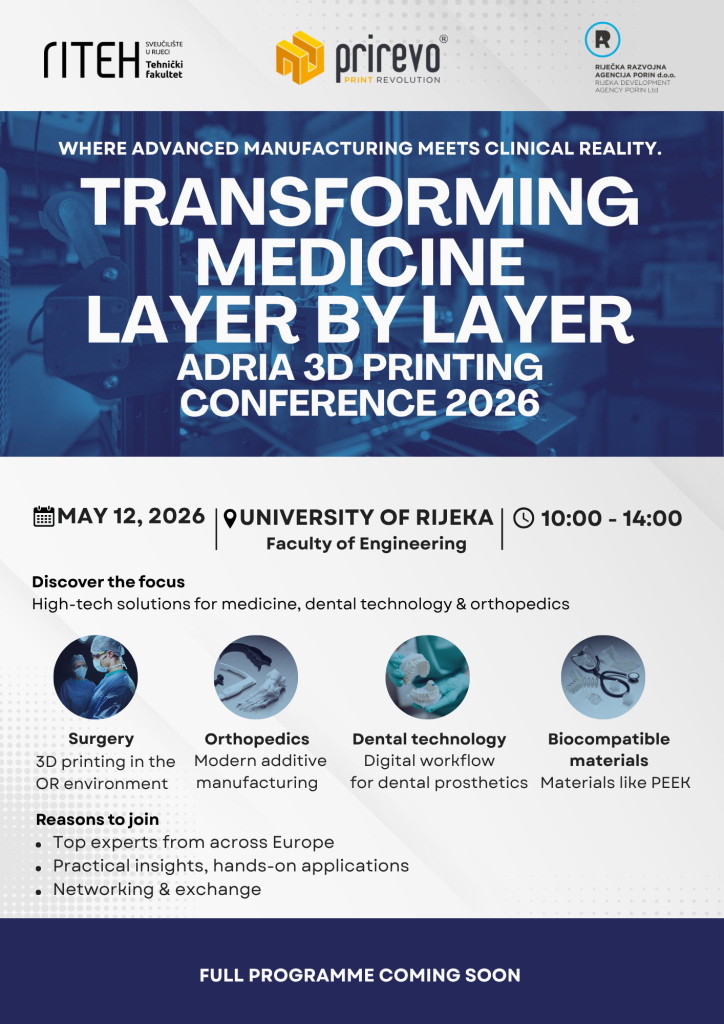 Tehnički fakultet Sveučilišta u Rijeci 12. svibnja 2026. godine bit će domaćinom Adria 3D Printing Conference 2026, konferencije koja spaja dva svijeta: visokotehnološku proizvodnju i svakodnevnu kliničku praksu.