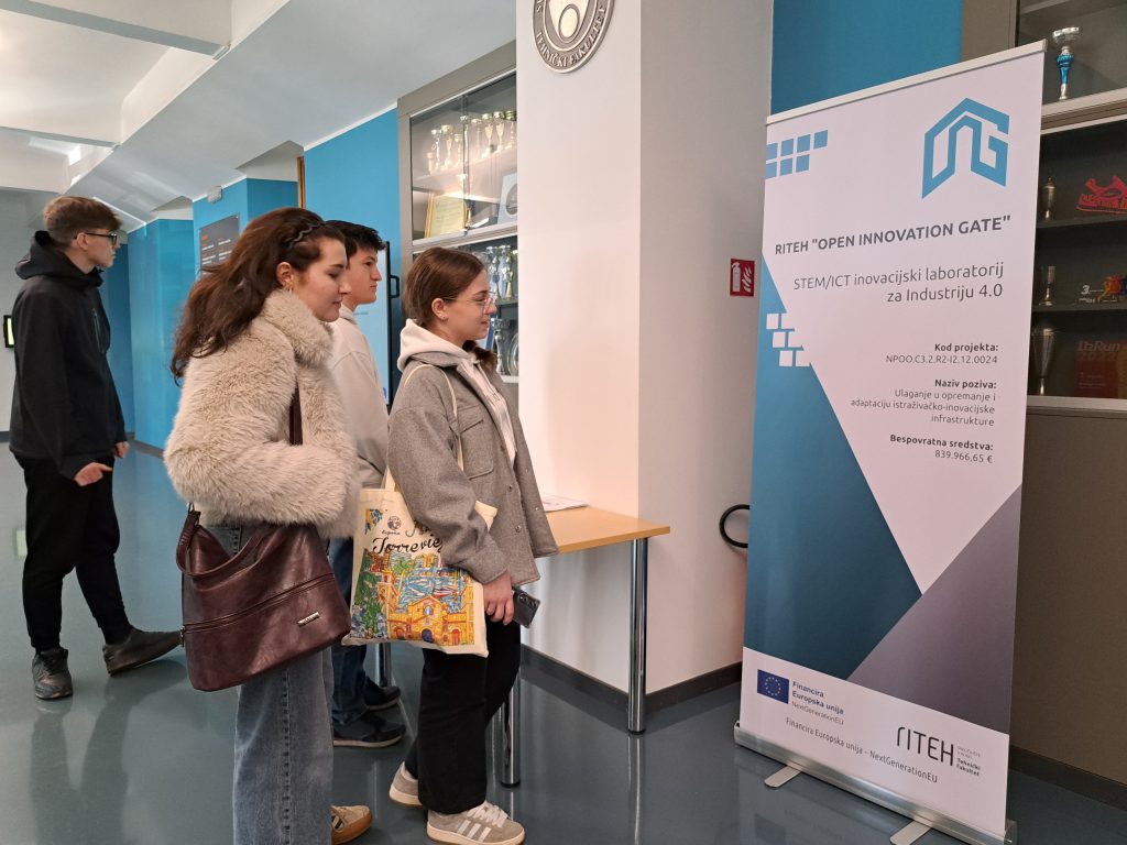 Osim razgledavanja 12 pokaznih mjesta na fakultetu, učenicima je predstavljen i projekt RITEH “Open Innovation Gate – STEM/ICT laboratorij za Industriju 4.0” ukupne vrijednosti 839.966,65 eura, financiran u 100% iznosu bespovratnim sredstvima Nacionalnog plana oporavka i otpornosti (NPOO). Realizacija projekta pretpostavlja ulaganje u integrirani laboratorijski sustav koji će omogućiti povezivanje ključnih laboratorija Fakulteta u jedinstveni Centar za mehatroniku i robotiku (RITEH), koji objedinjuje vrhunske ekspertize iz područja automatizacije, umjetne inteligencije i industrijske digitalizacije. Ovaj će centar predstavljati otvorenu i interdisciplinarnu STEM i ICT infrastrukturu koja studentima i istraživačima nudi napredne uvjete rada, a gospodarstvu osigurava kompetentnog partnera za razvoj inovativnih tehnoloških rješenja.
