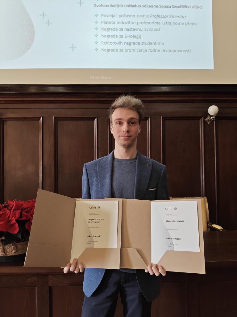 Nagrada rektora za izvrsnost dodijeljena je Jakovu Tomasiću koji je proglašen studentom generacije Sveučilišta. Jakov Tomasić završio je sveučilišni diplomski studij Računarstvo na Tehničkom fakultetu u Rijeci, gdje je tijekom studija pet puta nagrađen godišnjom nagradom Fakulteta za najuspješnijeg studenta. Tijekom svih pet godina aktivno je volontirao u Centru tehničke kulture, gdje su učenici pod njegovim mentorstvom osvojili dva Oskara znanja za prvo mjesto na državnom natjecanju iz informatike.