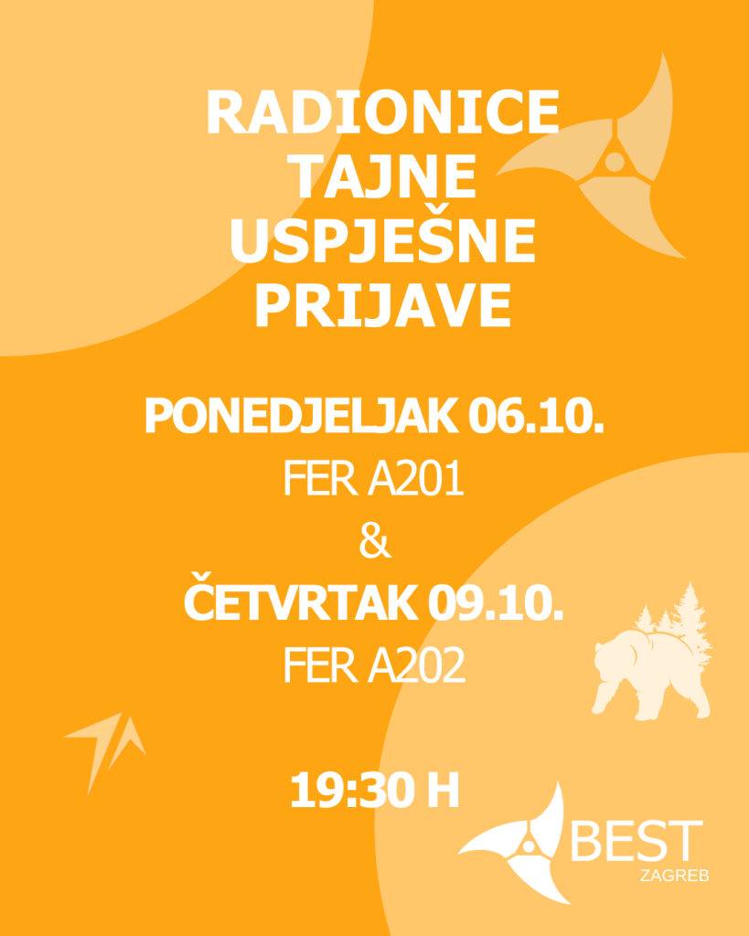 Kako bi imao što bolju šansu biti odabran, pridruži nam se na jednoj od radionica ovaj ili idući četvrtak (06.10. na FER-u, dvorana A201 ili 09.10. na FER-u, dvorana A202) u 19:30h gdje ćeš naučiti koji je proces prijave, na što treba paziti, kako apsolutno razvaliti motivacijsko pismo, te kako provesti bombastično ljeto koje ćeš prepričavati frendovima cijelu godinu! A nakon toga nam se možeš pridružiti na druženju u BEST-u Zagreb i saznati kako to izgleda s druge strane kulisa.
