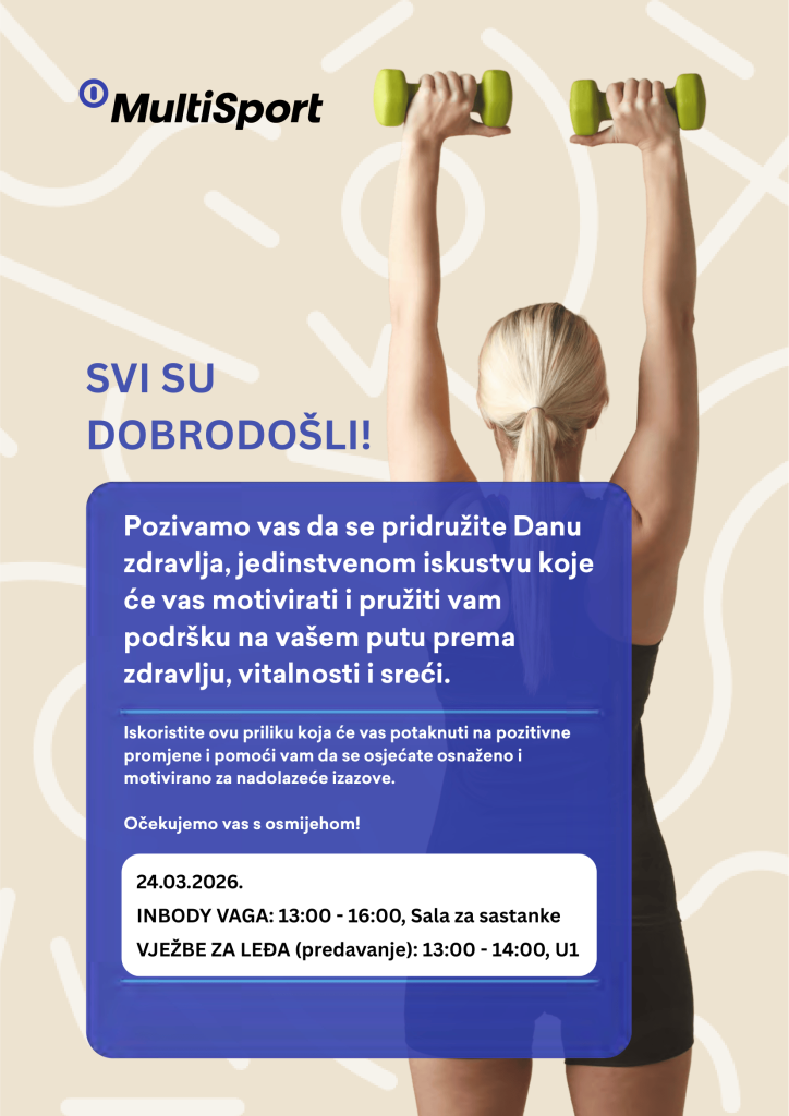 Pozivamo vas na Dan zdravlja Multisporta koji će se održati u utorak, 24. ožujka 2026. godine, od 13:00 do 16:00 sati na Tehničkom fakultetu.