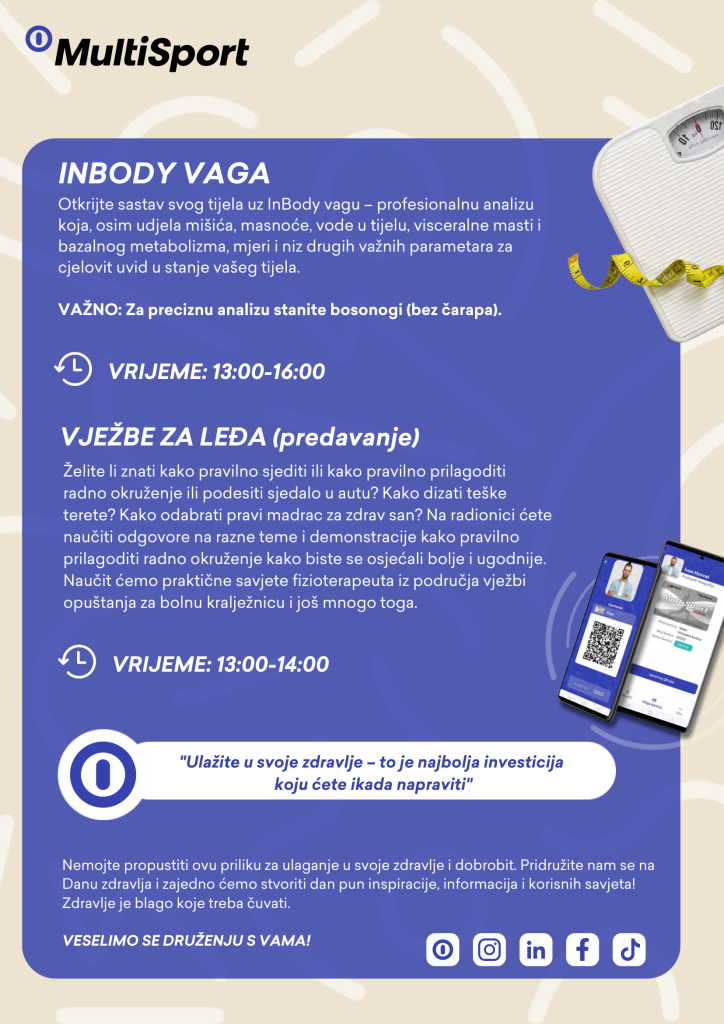 U sklopu programa predviđeno je jednosatno predavanje te mogućnost analize sastava tijela pomoću INBODY vage. Dodatne informacije dostupne su u pozivnici u prilogu.