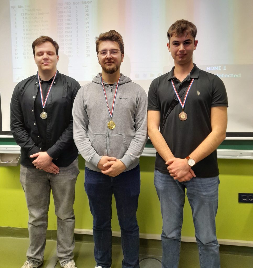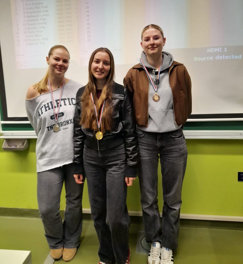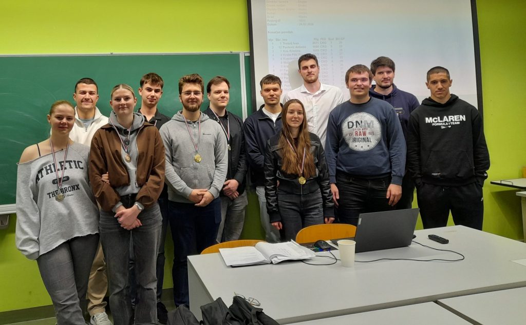 Jučer je održano 6. prvenstvo Fakulteta u šahu za studentice i studente. Uz sudjelovanje 13 studenata i studentica i dobru zabavu igralo se 7 kola u tempu 7 minuta po igraču i 3 sekunde po potezu za partiju. Turnir je odigran zajednički za studente i studentice. Nakon velikih borbi i niti jedne neriješene partije, pobjedu je kod studentica odnijela Kristina Kos, druga je bila Ema Pozderac i treća Tea Marinić. Kod studenata je sa svih 7 pobjeda prvo mjesto osvojio Ivan Trošelj, drugi je bio Antonio Pavlović i treći Fran Krsto Pilić. Pobjednici su dobili zaslužene medalje, a svima ostalima čestitke na sudjelovanju. Nadamo se de se vidimo i dogodine u još većem broju.