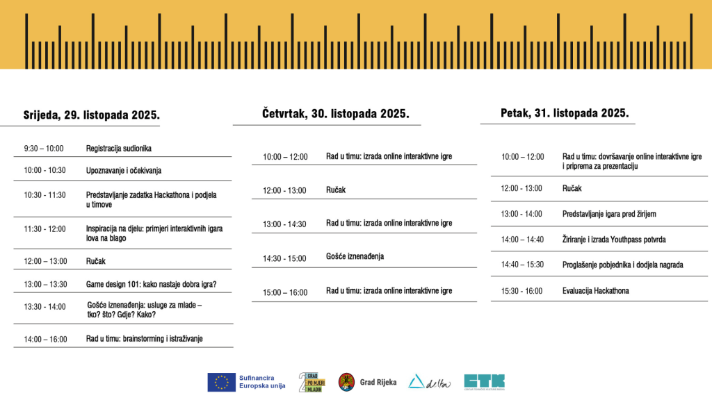 Centar tehničke kulture Rijeka organizira Hackathon “Lov na usluge” koji će se održati od 29. do 31. listopada 2025. u prostorima CTK Rijeka (Školjić 6). Tema Hackathona je izrada interaktivne online igrice kroz tri dana intenzivnog timskog rada uz mentorstvo stručnjaka iz područja razvoja i dizajna igara.