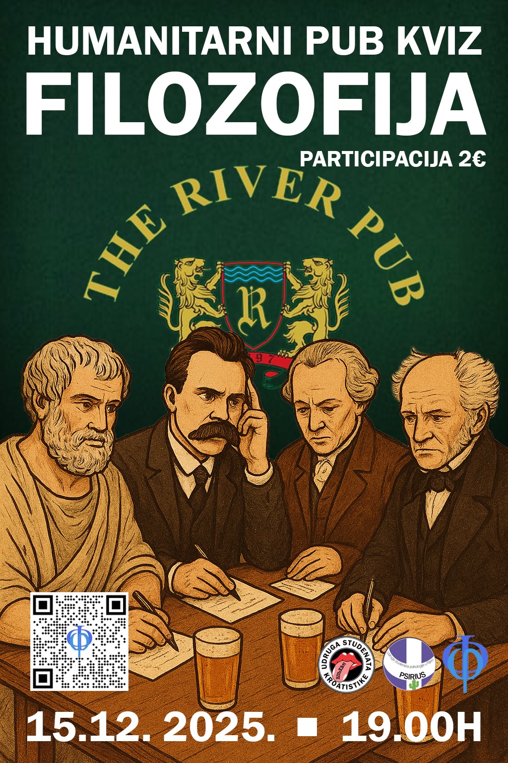 Udruga studenata filozofije FURIJA s veseljem vas svih poziva da dođete pokazati svoje znanje iz filozofije i osvojite vrijedne nagrade! Kviz je humanitarnog tipa te je participacija 2 eura po osobi. Skuplja se za udrugu Rijeka 21. Prijavljujete se u grupama od 2 do 5 članova.