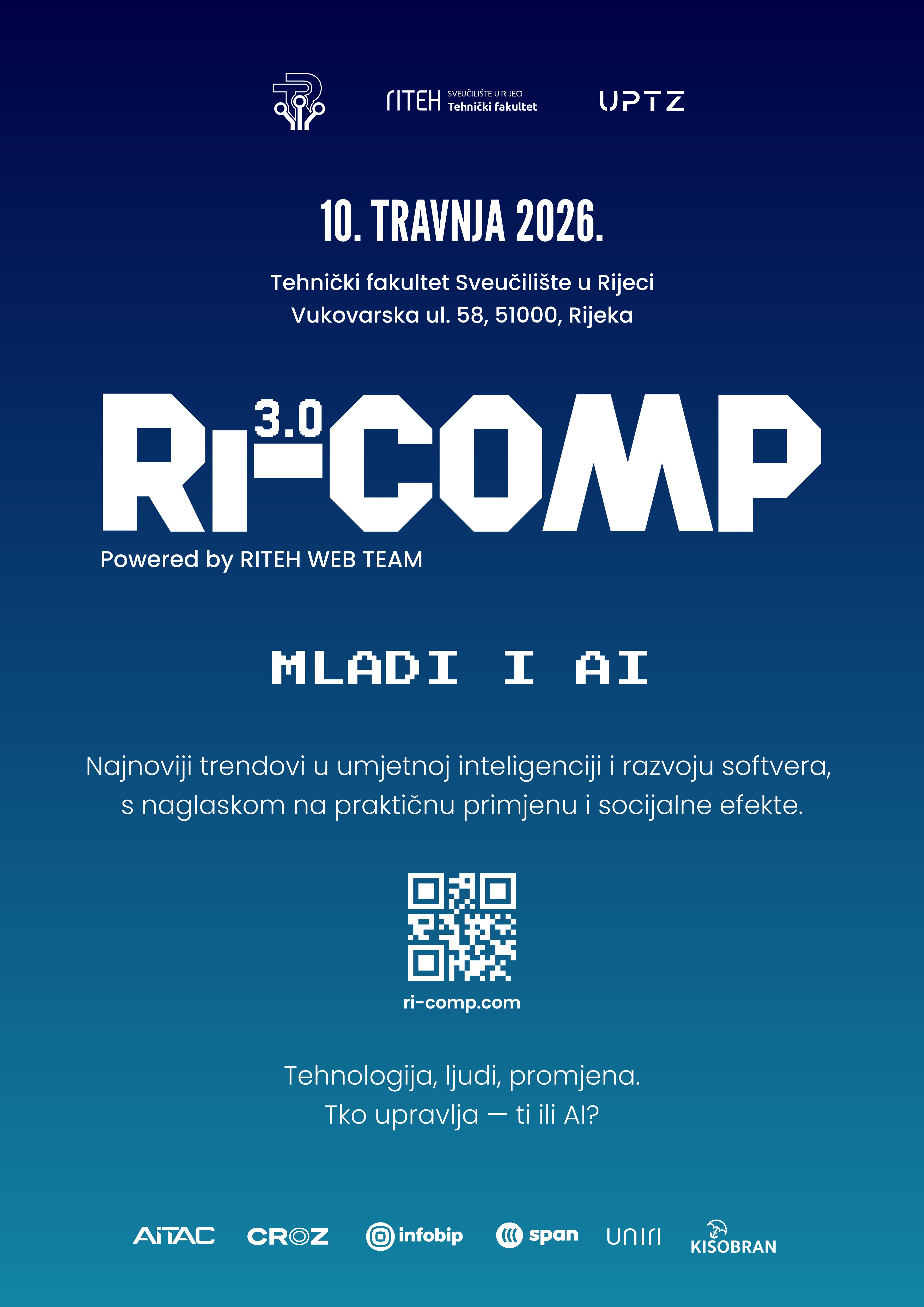 Dana 10. travnja 2026. na Tehničkom fakultetu u Rijeci održava se Ri-Comp 3.0 – konferencija koja okuplja studente, developere i stručnjake iz industrije s ciljem razumijevanja stvarnog utjecaja umjetne inteligencije na računarstvo i svakodnevni inženjerski rad.