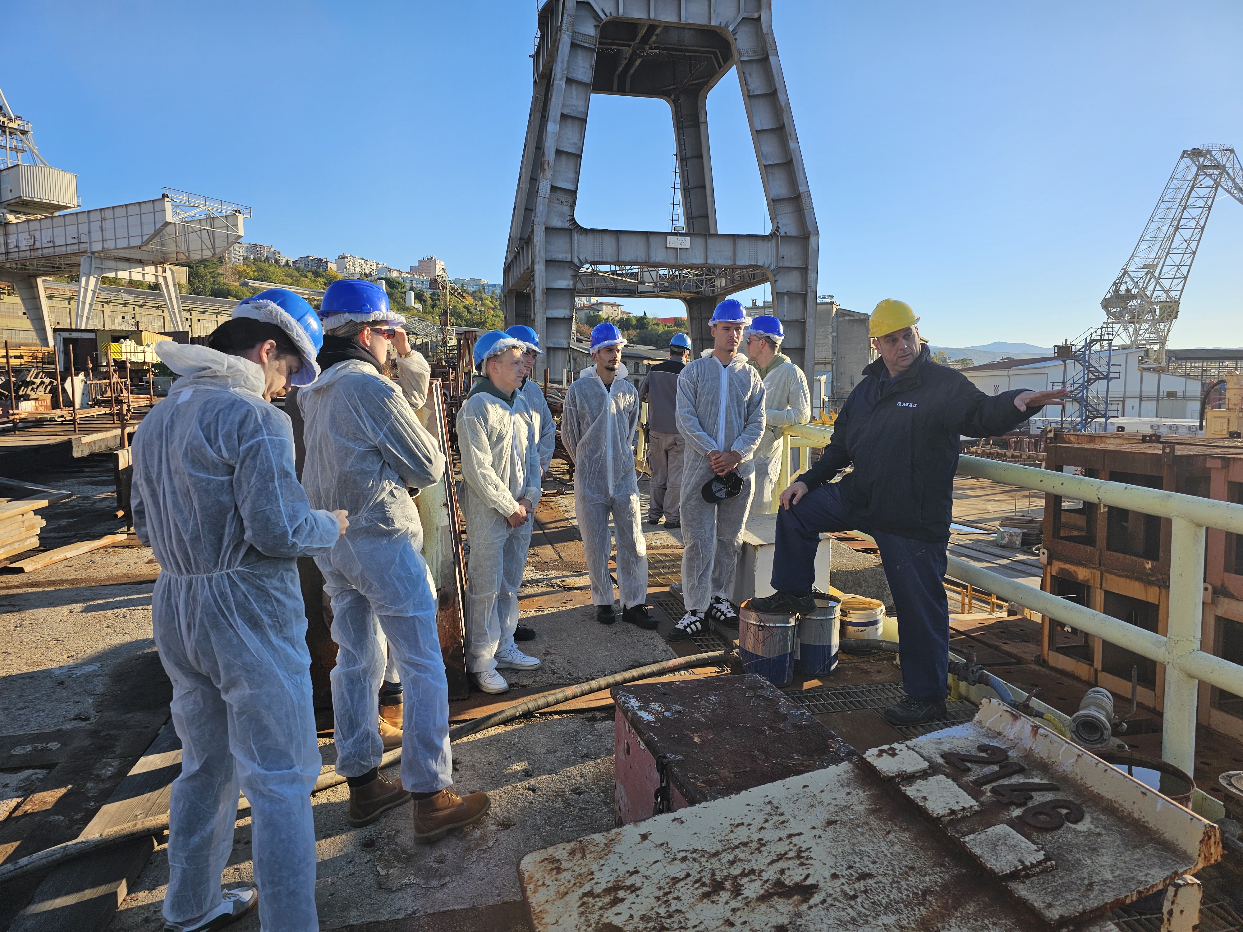 U sklopu kolegija Tehnologija brodogradnje, studenti treće godine prijediplomskog sveučilišnog studija Brodogradnje imali su priliku sudjelovati u terenskoj nastavi održanoj u brodogradilištu “3. Maj” u Rijeci. Ova posjeta omogućila je studentima neposredan uvid u stvarne proizvodne procese, tehnologije i organizaciju rada u realnom brodogradilištu, čime se teorijsko znanje stečeno na fakultetu povezalo s praktičnim iskustvom iz industrije. Terenska nastava predstavlja neprocjenjiv oblik obrazovanja budućih inženjera jer omogućuje direktan kontakt s realnim radnim okruženjem, upoznavanje s aktualnim tehnološkim izazovima i rješenjima, razvijanje stručnih kompetencija i profesionalne odgovornosti, te motivaciju za daljnje usavršavanje i karijerni razvoj.